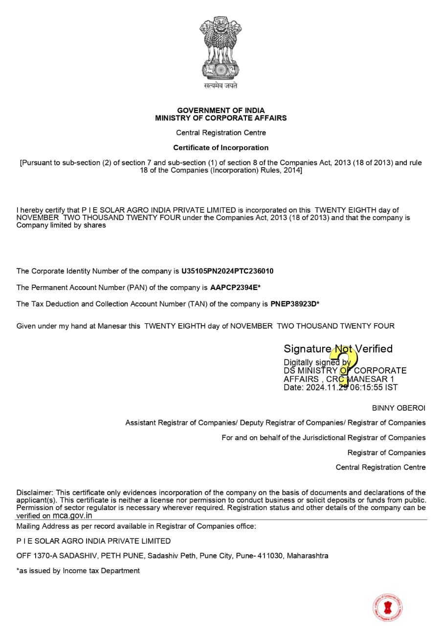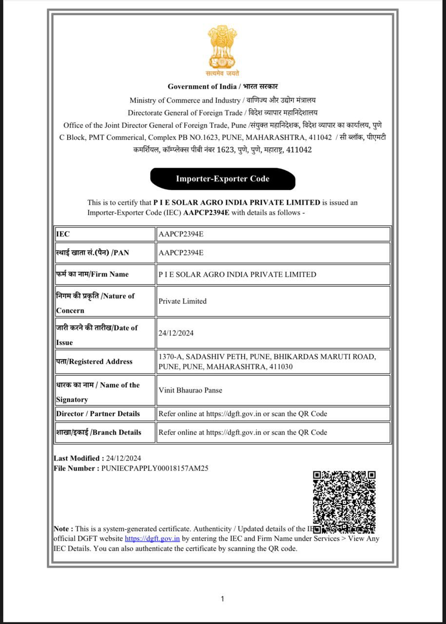 P I E Solar Agro India Pvt Ltd is an associated company of Allround Agritech Solutions Pvt Ltd, focused on the agriculture and solar components of integrated and associated projects.